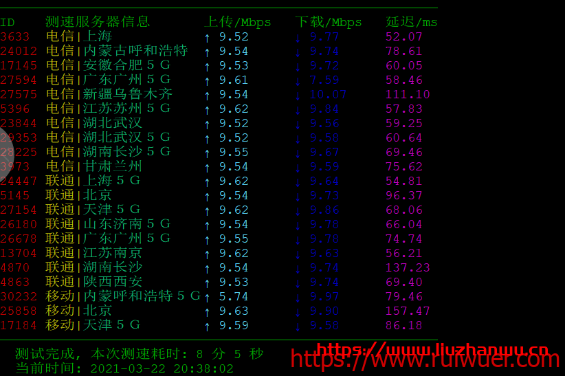 -> Traceroute Test (IPV4) Traceroute to China, Beijing CU (TCP Mode, Max 30 Hop) ============================================================ traceroute to 123.125.99.1 (123.125.99.1), 30 hops max, 32 byte packets 1 10.0.0.1 0.23 ms * LAN Address 2 180.215.130.1 38.62 ms AS64050 China, Hong Kong, rackip.com 3 172.20.13.84 2.12 ms * LAN Address 4 63.140.7.5 1.64 ms AS4809 China, Hong Kong, ChinaTelecom 5 59.43.247.93 1.70 ms * China, ChinaTelecom 6 59.43.250.173 39.54 ms * China, ChinaTelecom 7 * 8 59.43.132.21 47.61 ms * China, ChinaTelecom 9 * 10 * 11 219.158.44.129 46.76 ms AS4837 China, ChinaUnicom 12 219.158.4.157 44.02 ms AS4837 China, ChinaUnicom 13 61.49.214.22 125.16 ms AS4808 China, Beijing, ChinaUnicom 14 125.33.187.122 117.24 ms AS4808 China, Beijing, ChinaUnicom 15 124.65.194.46 93.15 ms AS4808 China, Beijing, ChinaUnicom 16 61.135.113.154 122.39 ms AS4808 China, Beijing, ChinaUnicom 17 * 18 * 19 123.125.99.1 97.85 ms AS4808 China, Beijing, ChinaUnicom Traceroute to China, Beijing CT (TCP Mode, Max 30 Hop) ============================================================ traceroute to 180.149.128.9 (180.149.128.9), 30 hops max, 32 byte packets 1 10.0.0.1 0.38 ms * LAN Address 2 180.215.130.1 21.56 ms AS64050 China, Hong Kong, rackip.com 3 172.20.13.84 3.80 ms * LAN Address 4 63.140.7.5 1.78 ms AS4809 China, Hong Kong, ChinaTelecom 5 59.43.247.85 1.58 ms * China, ChinaTelecom 6 59.43.250.173 39.55 ms * China, ChinaTelecom 7 * 8 59.43.131.253 43.93 ms * China, ChinaTelecom 9 * 10 36.110.244.46 44.30 ms AS23724 China, Beijing, ChinaTelecom 11 36.110.246.198 44.13 ms AS23724 China, Beijing, ChinaTelecom 12 180.149.128.9 49.34 ms AS23724 China, Beijing, ChinaTelecom Traceroute to China, Beijing CM (TCP Mode, Max 30 Hop) ============================================================ traceroute to 211.136.25.153 (211.136.25.153), 30 hops max, 32 byte packets 1 10.0.0.1 0.15 ms * LAN Address 2 180.215.130.1 9.84 ms AS64050 China, Hong Kong, rackip.com 3 172.20.13.84 4.42 ms * LAN Address 4 63.140.7.5 1.55 ms AS4809 China, Hong Kong, ChinaTelecom 5 59.43.246.177 1.60 ms * China, ChinaTelecom 6 59.43.250.173 39.42 ms * China, ChinaTelecom 7 * 8 59.43.132.25 51.67 ms * China, ChinaTelecom 9 * 10 202.97.17.62 44.10 ms AS4134 China, ChinaTelecom 11 * 12 221.183.9.197 40.73 ms AS9808 China, ChinaMobile 13 * 14 * 15 111.24.2.134 87.29 ms AS9808 China, ChinaMobile 16 * 17 * 18 211.136.67.166 125.18 ms AS56048 China, Beijing, ChinaMobile 19 * 20 * 21 * 22 211.136.25.153 118.94 ms AS56048 China, Beijing, ChinaMobile Traceroute to China, Shanghai CU (TCP Mode, Max 30 Hop) ============================================================ traceroute to 58.247.8.158 (58.247.8.158), 30 hops max, 32 byte packets 1 10.0.0.1 0.29 ms * LAN Address 2 180.215.130.1 35.48 ms AS64050 China, Hong Kong, rackip.com 3 172.20.13.84 1.03 ms * LAN Address 4 63.140.7.5 1.38 ms AS4809 China, Hong Kong, ChinaTelecom 5 59.43.246.181 6.60 ms * China, ChinaTelecom 6 59.43.189.81 30.42 ms * China, ChinaTelecom 7 * 8 59.43.130.217 28.45 ms * China, ChinaTelecom 9 219.158.38.241 31.58 ms AS4837 China, ChinaUnicom 10 219.158.9.97 34.13 ms AS4837 China, ChinaUnicom 11 * 12 139.226.228.46 29.98 ms AS17621 China, Shanghai, ChinaUnicom 13 * 14 58.247.221.178 67.46 ms AS17621 China, Shanghai, ChinaUnicom 15 139.226.225.22 62.78 ms AS17621 China, Shanghai, ChinaUnicom 16 58.247.8.153 76.30 ms AS17621 China, Shanghai, ChinaUnicom 17 * 18 * 19 * 20 * 21 * 22 * 23 * 24 * 25 * 26 * 27 * 28 * 29 * 30 * Traceroute to China, Shanghai CT (TCP Mode, Max 30 Hop) ============================================================ traceroute to 180.153.28.5 (180.153.28.5), 30 hops max, 32 byte packets 1 10.0.0.1 0.53 ms * LAN Address 2 180.215.130.1 4.60 ms AS64050 China, Hong Kong, rackip.com 3 172.20.13.84 4.27 ms * LAN Address 4 63.140.7.5 1.60 ms AS4809 China, Hong Kong, ChinaTelecom 5 59.43.247.85 1.50 ms * China, ChinaTelecom 6 59.43.188.229 55.61 ms * China, ChinaTelecom 7 59.43.187.61 30.25 ms * China, ChinaTelecom 8 59.43.138.53 34.01 ms * China, ChinaTelecom 9 101.95.88.218 28.64 ms AS4812 China, Shanghai, ChinaTelecom 10 124.74.166.138 30.52 ms AS4812 China, Shanghai, ChinaTelecom 11 101.95.225.34 28.54 ms AS4811 China, Shanghai, ChinaTelecom 12 101.227.255.46 33.83 ms AS4812 China, Shanghai, ChinaTelecom 13 61.152.24.233 90.17 ms AS4812 China, Shanghai, ChinaTelecom 14 * 15 101.95.225.206 90.73 ms AS4811 China, Shanghai, ChinaTelecom 16 101.227.255.34 95.52 ms AS4812 China, Shanghai, ChinaTelecom 17 180.153.28.5 94.30 ms AS4812 China, Shanghai, ChinaTelecom Traceroute to China, Shanghai CM (TCP Mode, Max 30 Hop) ============================================================ traceroute to 221.183.55.22 (221.183.55.22), 30 hops max, 32 byte packets 1 10.0.0.1 0.45 ms * LAN Address 2 180.215.130.1 3.84 ms AS64050 China, Hong Kong, rackip.com 3 172.20.13.84 34.90 ms * LAN Address 4 63.140.7.5 1.57 ms AS4809 China, Hong Kong, ChinaTelecom 5 59.43.247.85 1.39 ms * China, ChinaTelecom 6 59.43.248.201 6.07 ms * China, ChinaTelecom 7 * 8 59.43.130.113 8.82 ms * China, ChinaTelecom 9 * 10 202.97.63.206 10.30 ms AS4134 China, ChinaTelecom 11 * 12 221.176.24.1 5.94 ms AS9808 China, ChinaMobile 13 221.176.22.10 110.29 ms AS9808 China, ChinaMobile 14 * 15 * 16 * 17 * 18 * 19 * 20 * 21 * 22 * 23 * 24 * 25 * 26 * 27 * 28 * 29 * 30 * Traceroute to China, Guangzhou CU (TCP Mode, Max 30 Hop) ============================================================ traceroute to 210.21.4.130 (210.21.4.130), 30 hops max, 32 byte packets 1 10.0.0.1 0.21 ms * LAN Address 2 180.215.130.1 1.43 ms AS64050 China, Hong Kong, rackip.com 3 172.20.13.84 2.53 ms * LAN Address 4 63.140.7.5 1.40 ms AS4809 China, Hong Kong, ChinaTelecom 5 59.43.247.85 13.75 ms * China, ChinaTelecom 6 59.43.188.121 5.31 ms * China, ChinaTelecom 7 * 8 59.43.130.145 7.57 ms * China, ChinaTelecom 9 219.158.40.169 10.69 ms AS4837 China, ChinaUnicom 10 219.158.10.249 13.80 ms AS4837 China, ChinaUnicom 11 112.91.0.246 1