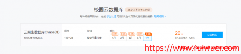 我们可以看到有云原生数据库年只需要20元,看来确实对给学生优惠力度挺大的。
