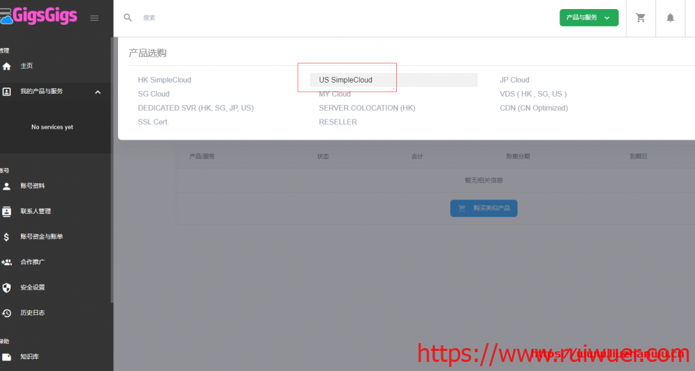GigsGigsCloud美国高防云服务器选择流程,点击文章当中的直达链接注册账号并登陆,然后如下图选择即可。