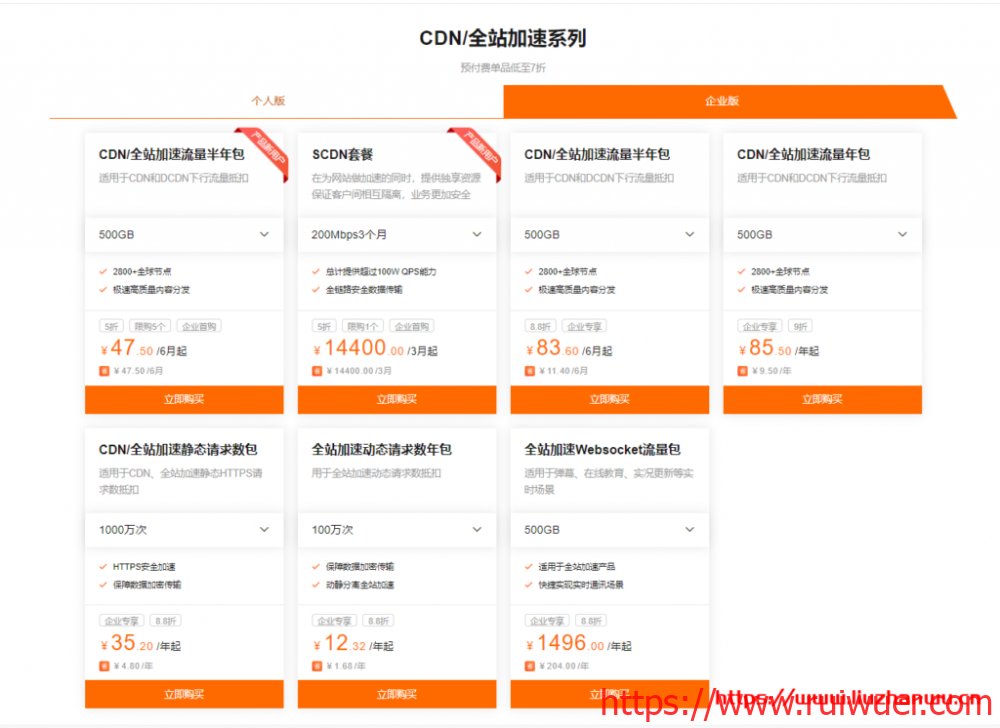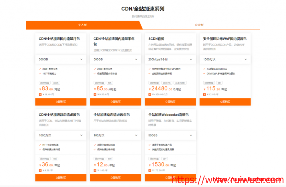 如下图所示,CDN/全站加速国内流量月包500GB – 83.6元/月起,CDN/全站加速国内流量半年包1TB – 162元/6月起,CDN/全站加速静态请求数包1000万次 – 36元/年起,全站加速动态请求数年包100万次 – 12.6元/年起,新老用户同享。