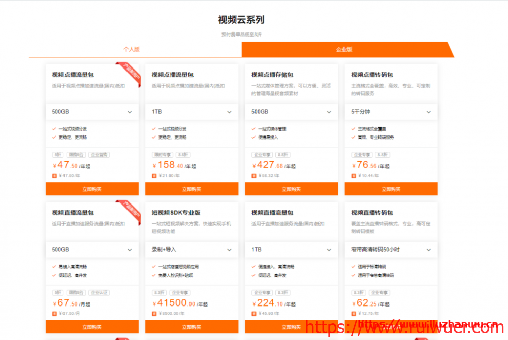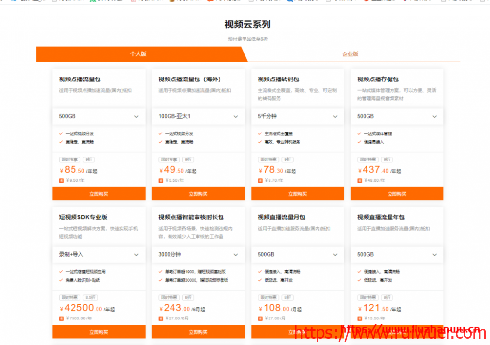 如下图所示,视频点播国内流量包500GB – 85.5元/年起,视频点播亚太1流量包100GB – 49.5元/年起,视频点播存储包500GB – 437.4元/年起,视频直播流量年包500GB – 121.5元/年起,新老用户同享。