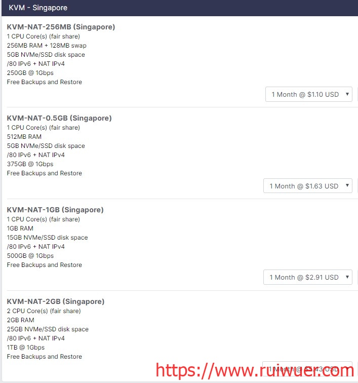 | KVM-NAT-256MB (Singapore) | KVM-NAT-0.5GB (Singapore) | KVM-NAT-1GB (Singapore) | KVM-NAT-2GB (Singapore) |