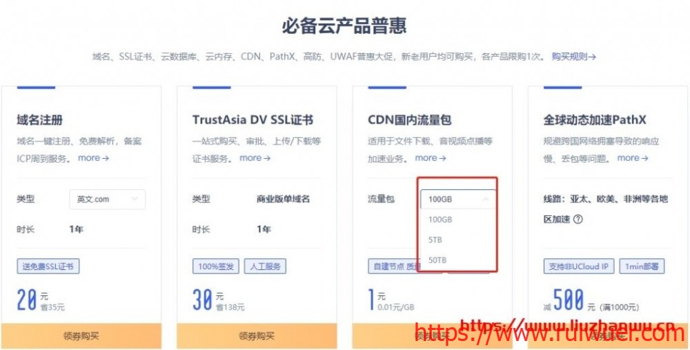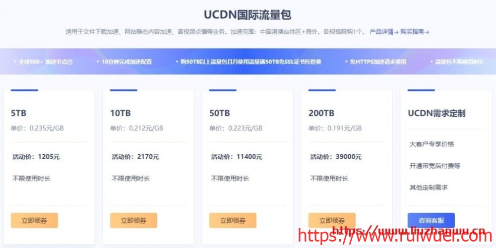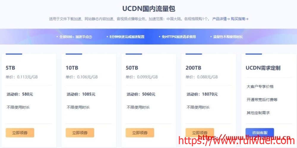 去UCloud全球大促活动页面必备云产品普惠专题(点此直达)领券,这里有100GB/5TB/50TB三种规格的CDN国内流量包代金券,其中1元/100GB、580元/5TB和5060元/50TB。由于只能任选其一,站长建议首次先领1元/100GB的券,先试试水,看看他家产品喜不喜欢。