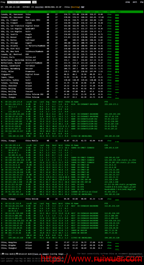 ---------------------------------------------------------------------- 广州电信 traceroute to 14.215.116.1 (14.215.116.1), 30 hops max, 32 byte packets 1 194.105.63.1 5.23 ms AS137443 China, Hong Kong 2 10.3.103.9 2.75 ms * LAN Address 3 118.184.22.118 3.24 ms * China, Hong Kong, 51idc.com 4 59.43.247.21 2.55 ms * China, ChinaTelecom 5 59.43.183.109 33.97 ms * China, ChinaTelecom 6 * 7 * 8 59.43.80.118 13.33 ms * China, ChinaTelecom 9 113.108.208.190 12.03 ms AS58466 China, Guangdong, Guangzhou, ChinaTelecom 10 113.96.4.226 38.34 ms AS58466 China, Guangdong, Guangzhou, ChinaTelecom 11 183.2.145.194 15.14 ms AS58466 China, Guangdong, Guangzhou, ChinaTelecom 12 183.56.129.10 12.61 ms AS58466 China, Guangdong, Guangzhou, ChinaTelecom 13 14.215.116.1 12.06 ms AS58466 China, Guangdong, Guangzhou, ChinaTelecom ---------------------------------------------------------------------- 上海电信 traceroute to 101.95.120.109 (101.95.120.109), 30 hops max, 32 byte packets 1 194.105.63.1 6.70 ms AS137443 China, Hong Kong 2 10.3.103.9 2.73 ms * LAN Address 3 118.184.22.118 2.39 ms * China, Hong Kong, 51idc.com 4 59.43.250.25 11.59 ms * China, ChinaTelecom 5 59.43.248.109 28.68 ms * China, ChinaTelecom 6 * 7 59.43.130.213 37.28 ms * China, ChinaTelecom 8 61.152.24.190 50.20 ms AS4812 China, Shanghai, ChinaTelecom 9 101.95.120.109 31.57 ms AS4812 China, Shanghai, ChinaTelecom ---------------------------------------------------------------------- 厦门电信 traceroute to 117.28.254.129 (117.28.254.129), 30 hops max, 32 byte packets 1 194.105.63.1 3.74 ms AS137443 China, Hong Kong 2 10.3.103.9 2.59 ms * LAN Address 3 118.184.22.9 2.49 ms * China, Hong Kong, 51idc.com 4 59.43.247.229 2.99 ms * China, ChinaTelecom 5 59.43.187.177 6.70 ms * China, ChinaTelecom 6 59.43.187.121 8.39 ms * China, ChinaTelecom 7 59.43.130.117 14.37 ms * China, ChinaTelecom 8 59.43.143.2 26.25 ms * China, ChinaTelecom 9 * 10 27.159.81.210 43.99 ms AS133775 China, Fujian, Xiamen, ChinaTelecom 11 117.25.141.110 44.33 ms AS133775 China, Fujian, Xiamen, ChinaTelecom 12 117.28.254.129 34.83 ms AS4809 China, Fujian, Xiamen, ChinaTelecom ---------------------------------------------------------------------- 重庆联通 traceroute to 113.207.25.138 (113.207.25.138), 30 hops max, 32 byte packets 1 194.105.63.1 4.50 ms AS137443 China, Hong Kong 2 10.3.103.33 8.88 ms * LAN Address 3 118.184.22.89 1.94 ms * China, Hong Kong, 51idc.com 4 162.245.124.17 3.93 ms AS10099 China, Hong Kong, ChinaUnicom 5 202.77.23.25 7.73 ms AS10099 China, Hong Kong, ChinaUnicom 6 219.158.20.97 10.83 ms AS4837 China, ChinaUnicom 7 219.158.20.221 13.67 ms AS4837 China, ChinaUnicom 8 219.158.8.113 15.16 ms AS4837 China, ChinaUnicom 9 219.158.99.210 36.03 ms AS4837 China, ChinaUnicom 10 113.207.25.138 31.98 ms AS4837 China, Chongqing, ChinaUnicom ---------------------------------------------------------------------- 成都联通 traceroute to 119.6.6.6 (119.6.6.6), 30 hops max, 32 byte packets 1 194.105.63.1 3.94 ms AS137443 China, Hong Kong 2 10.3.103.33 2.13 ms * LAN Address 3 118.184.22.89 2.29 ms * China, Hong Kong, 51idc.com 4 162.245.124.17 2.52 ms AS10099 China, Hong Kong, ChinaUnicom 5 43.252.86.129 2.27 ms AS10099 China, Hong Kong, ChinaUnicom 6 219.158.10.53 10.07 ms AS4837 China, ChinaUnicom 7 219.158.98.93 10.91 ms AS4837 China, ChinaUnicom 8 219.158.97.1 57.10 ms AS4837 China, ChinaUnicom 9 219.158.102.186 81.82 ms AS4837 China, ChinaUnicom 10 * 11 119.7.220.226 145.35 ms AS4837 China, Sichuan, Chengdu, ChinaUnicom 12 119.6.6.6 83.81 ms AS4837 China, Sichuan, Chengdu, ChinaUnicom ---------------------------------------------------------------------- 上海移动 traceroute to 120.204.197.126 (120.204.197.126), 30 hops max, 32 byte packets 1 194.105.63.1 20.23 ms AS137443 China, Hong Kong 2 10.3.103.9 2.72 ms * LAN Address 3 10.3.102.2 2.94 ms * LAN Address 4 * 5 223.120.2.117 3.25 ms AS58453 China, ChinaMobile 6 223.120.2.78 7.56 ms AS58453 China, ChinaMobile 7 223.120.22.9 57.14 ms AS58453 China, ChinaMobile 8 221.183.55.46 57.99 ms AS9808 China, ChinaMobile 9 221.183.25.189 163.99 ms AS9808 China, ChinaMobile 10 221.176.22.29 59.57 ms AS9808 China, ChinaMobile 11 111.24.3.89 33.26 ms AS9808 China, ChinaMobile 12 * 13 117.185.10.234 34.92 ms AS9808 China, Shanghai, ChinaMobile 14 120.204.194.10 38.30 ms AS9808 China, Shanghai, ChinaMobile 15 120.204.197.126 38.27 ms AS9808 China, Shanghai, ChinaMobile ---------------------------------------------------------------------- 成都移动 traceroute to 183.221.253.100 (183.221.253.100), 30 hops max, 32 byte packets 1 194.105.63.1 7.02 ms AS137443 China, Hong Kong 2 10.3.103.9 2.64 ms * LAN Address 3 10.3.102.2 6.56 ms * LAN Address 4 * 5 223.120.2.117 6.59 ms AS58453 China, ChinaMobile 6 223.120.2.78 7.55 ms AS58453 China, ChinaMobile 7 * 8 221.183.52.85 56.87 ms AS9808 China, ChinaMobile 9 221.183.68.142 71.44 ms AS9808 China, ChinaMobile 10 221.183.22.34 58.25 ms AS9808 China, ChinaMobile 11 * 12 117.134.42.122 11.70 ms AS9808 China, Guangdong, Guangzhou, ChinaMobile 13 183.221.253.100 10.93 ms AS9808 China, Sichuan, Chengdu, ChinaMobile ---------------------------------------------------------------------- 成都教育网 traceroute to 202.112.14.151 (202.112.14.151), 30 hops max, 32 byte packets 1 194.105.63.1 9.89 ms AS137443 China, Hong Kong 2 10.3.103.9 2.78 ms * LAN Address 3 118.184.22.118 2.36 ms * China, Hong Kong, 51idc.com 4 59.43.248.121 2.63 ms * China, ChinaTelecom 5 59.43.183.109 8.85 ms * China, ChinaTelecom 6 * 7 59.43.130.145 10.74 ms * China, ChinaTelecom 8 202.97.55.50 15.98 ms AS4134 China, ChinaTelecom 9 202.97.18.233 12.85 ms AS4134 China, ChinaTelecom 10 * 11 101.4.114.70 11.21 ms AS4538 China, CHINAEDU 12 101.4.117.217 50.30 ms AS4538 China, CHINAEDU 13 101.4.116.90 57.29 ms AS4538 China, CHINAEDU 14 * 15 202.115.254.238 51.08 ms AS4538 China, Sichuan, Chengdu, CHINAEDU 16 202.115.0.1 49.90 ms AS4538,AS24355 China, Sichuan, Chengdu, CHINAEDU 17 * 18 202.112.14.151 49.31 ms A