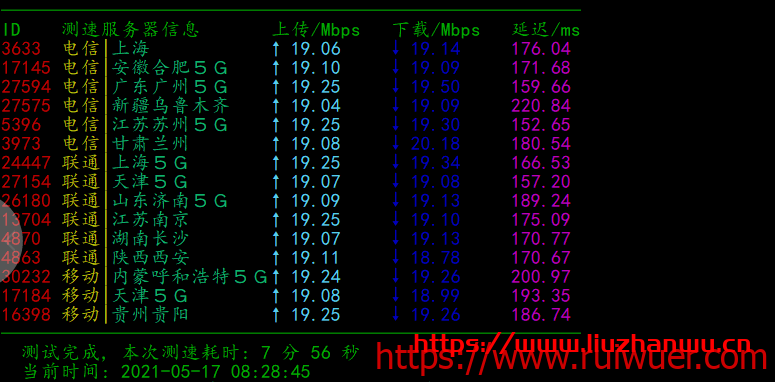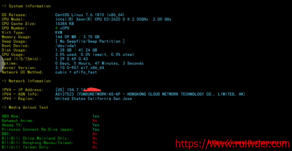 ---------------------------------------------------------------------- 广州电信 traceroute to 14.215.116.1 (14.215.116.1), 30 hops max, 32 byte packets 1 154.7.13.1 28.69 ms AS137523 United States, California, San Jose, cogentco.com 2 10.11.10.57 13.25 ms * LAN Address 3 10.253.0.165 0.85 ms * LAN Address 4 10.253.0.33 0.87 ms * LAN Address 5 218.30.49.145 1.62 ms AS4134 United States, California, Los Angeles, ChinaTelecom 6 59.43.189.217 157.73 ms * China, ChinaTelecom 7 * 8 59.43.130.149 159.85 ms * China, ChinaTelecom 9 202.97.82.38 165.05 ms AS4134 China, ChinaTelecom 10 113.96.0.117 161.25 ms AS58466 China, Guangdong, Guangzhou, ChinaTelecom 11 113.96.4.226 162.69 ms AS58466 China, Guangdong, Guangzhou, ChinaTelecom 12 * 13 183.56.128.10 161.56 ms AS58466 China, Guangdong, Guangzhou, ChinaTelecom 14 14.215.116.1 162.06 ms AS58466 China, Guangdong, Guangzhou, ChinaTelecom ---------------------------------------------------------------------- 上海电信 traceroute to 101.95.120.109 (101.95.120.109), 30 hops max, 32 byte packets 1 154.7.13.1 2.01 ms AS137523 United States, California, San Jose, cogentco.com 2 10.11.10.57 0.93 ms * LAN Address 3 10.253.0.165 0.64 ms * LAN Address 4 10.253.0.33 0.73 ms * LAN Address 5 218.30.49.145 1.73 ms AS4134 United States, California, Los Angeles, ChinaTelecom 6 59.43.182.146 149.05 ms * China, ChinaTelecom 7 59.43.247.101 167.26 ms * China, ChinaTelecom 8 * 9 59.43.132.13 158.82 ms * China, ChinaTelecom 10 59.43.46.82 167.84 ms * China, ChinaTelecom 11 101.95.88.210 164.85 ms AS4812 China, Shanghai, ChinaTelecom 12 101.95.120.109 158.84 ms AS4812 China, Shanghai, ChinaTelecom ---------------------------------------------------------------------- 厦门电信 traceroute to 117.28.254.129 (117.28.254.129), 30 hops max, 32 byte packets 1 154.7.13.1 2.24 ms AS137523 United States, California, San Jose, cogentco.com 2 10.11.10.57 1.70 ms * LAN Address 3 10.253.0.165 3.18 ms * LAN Address 4 10.253.0.33 0.58 ms * LAN Address 5 218.30.49.145 1.82 ms AS4134 United States, California, Los Angeles, ChinaTelecom 6 59.43.182.146 185.60 ms * China, ChinaTelecom 7 59.43.247.125 170.81 ms * China, ChinaTelecom 8 59.43.188.69 172.63 ms * China, ChinaTelecom 9 59.43.132.13 162.52 ms * China, ChinaTelecom 10 59.43.142.234 187.40 ms * China, ChinaTelecom 11 59.43.98.206 204.48 ms * China, ChinaTelecom 12 * 13 27.159.81.214 197.85 ms AS133775 China, Fujian, Xiamen, ChinaTelecom 14 117.25.141.106 189.49 ms AS133775 China, Fujian, Xiamen, ChinaTelecom 15 117.28.254.129 206.23 ms AS4809 China, Fujian, Xiamen, ChinaTelecom ---------------------------------------------------------------------- 重庆联通 traceroute to 113.207.25.138 (113.207.25.138), 30 hops max, 32 byte packets 1 154.7.13.1 1.83 ms AS137523 United States, California, San Jose, cogentco.com 2 10.11.10.57 2.80 ms * LAN Address 3 10.253.0.165 0.74 ms * LAN Address 4 10.253.0.33 7.82 ms * LAN Address 5 218.30.49.145 1.44 ms AS4134 United States, California, Los Angeles, ChinaTelecom 6 59.43.189.217 157.45 ms * China, ChinaTelecom 7 * 8 59.43.130.145 160.34 ms * China, ChinaTelecom 9 * 10 219.158.10.249 173.26 ms AS4837 China, ChinaUnicom 11 219.158.99.210 191.82 ms AS4837 China, ChinaUnicom 12 113.207.25.138 207.33 ms AS4837 China, Chongqing, ChinaUnicom ---------------------------------------------------------------------- 成都联通 traceroute to 119.6.6.6 (119.6.6.6), 30 hops max, 32 byte packets 1 154.7.13.1 1.99 ms AS137523 United States, California, San Jose, cogentco.com 2 10.11.10.57 8.71 ms * LAN Address 3 10.253.0.165 26.16 ms * LAN Address 4 10.253.0.33 0.71 ms * LAN Address 5 218.30.49.145 1.68 ms AS4134 United States, California, Los Angeles, ChinaTelecom 6 59.43.189.217 158.08 ms * China, ChinaTelecom 7 * 8 59.43.130.145 160.38 ms * China, ChinaTelecom 9 * 10 * 11 219.158.97.74 188.21 ms AS4837 China, ChinaUnicom 12 119.6.197.206 181.57 ms AS4837 China, Sichuan, Chengdu, ChinaUnicom 13 119.7.220.218 207.24 ms AS4837 China, Sichuan, Chengdu, ChinaUnicom 14 119.6.6.6 203.66 ms AS4837 China, Sichuan, Chengdu, ChinaUnicom ---------------------------------------------------------------------- 上海移动 traceroute to 120.204.197.126 (120.204.197.126), 30 hops max, 32 byte packets 1 154.7.13.1 1.88 ms AS137523 United States, California, San Jose, cogentco.com 2 10.11.10.57 1.38 ms * LAN Address 3 10.253.0.165 0.63 ms * LAN Address 4 10.253.0.33 2.95 ms * LAN Address 5 218.30.49.145 1.78 ms AS4134 United States, California, Los Angeles, ChinaTelecom 6 59.43.182.142 130.97 ms * China, ChinaTelecom 7 59.43.247.101 216.13 ms * China, ChinaTelecom 8 59.43.188.73 146.51 ms * China, ChinaTelecom 9 59.43.131.253 145.12 ms * China, ChinaTelecom 10 202.97.42.13 144.65 ms AS4134 China, ChinaTelecom 11 202.97.33.106 150.56 ms AS4134 China, ChinaTelecom 12 202.97.87.134 162.56 ms AS4134 China, ChinaTelecom 13 * 14 * 15 * 16 120.204.194.14 187.40 ms AS9808 China, Shanghai, ChinaMobile 17 120.204.197.126 182.04 ms AS9808 China, Shanghai, ChinaMobile ---------------------------------------------------------------------- 成都移动 traceroute to 183.221.253.100 (183.221.253.100), 30 hops max, 32 byte packets 1 154.7.13.1 1.93 ms AS137523 United States, California, San Jose, cogentco.com 2 10.11.10.57 5.37 ms * LAN Address 3 10.253.0.165 0.84 ms * LAN Address 4 10.253.0.33 0.82 ms * LAN Address 5 218.30.49.145 1.78 ms AS4134 United States, California, Los Angeles, ChinaTelecom 6 59.43.189.217 157.70 ms * China, ChinaTelecom 7 59.43.187.101 159.06 ms * China, ChinaTelecom 8 59.43.130.101 159.86 ms * China, ChinaTelecom 9 202.97.55.50 164.27 ms AS4134 China, ChinaTelecom 10 202.97.36.226 196.64 ms AS4134 China, ChinaTelecom 11 202.97.26.222 179.35 ms AS4134 China, ChinaTelecom 12 221.183.68.65 196.64 ms AS9808 China, ChinaMobile 13 221.176.20.149 193.90 ms AS9808 China, ChinaMobile 14 221.176.20.125 193.60 ms AS9808 China, ChinaMobile 15 221.183.22.34 195.36 ms AS9808 China, ChinaMobile 16 221.183.37.114 195