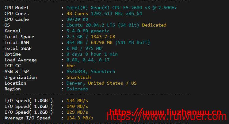 测试机器是双路e5-2680v3,2.5G主频,24核48线程,64G内存,2T HDD,站长开启了BBR,I/O平均134MB: