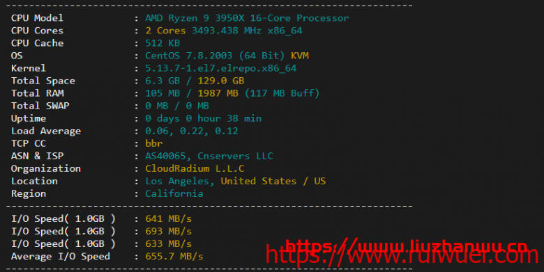 站长拿到的机器CPU为AMD Ryzen9 3950X 2核2G内存,160G nvme硬盘。站长默认开启BBR,I/O测试平均为655M的样子,很是不错