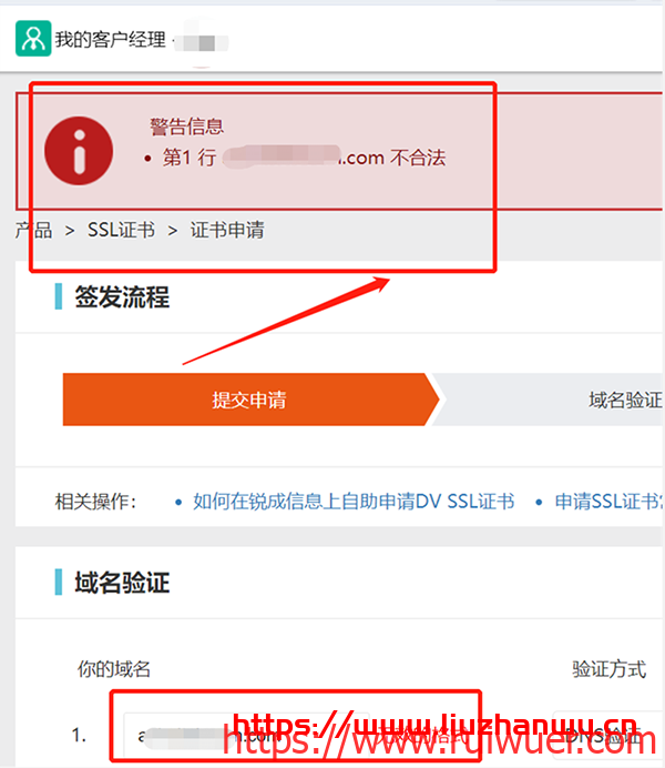 解决办法:请确认使用了正确的域名验证方法,并正确的完成了验证。