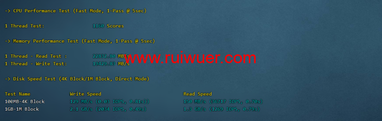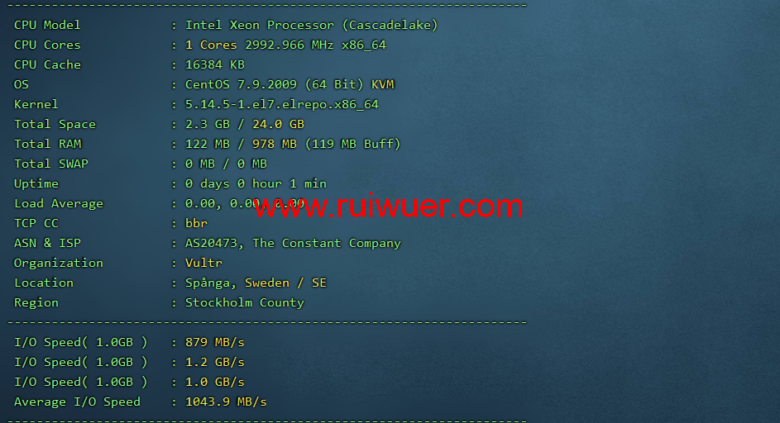 站长测评机器参数,1核1G套餐,开启bbr,硬盘测速I/O平均为1043MB/s,性能强悍啊