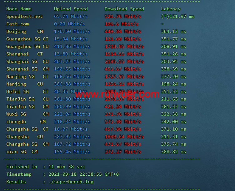 speedtest测试国内上行下行,上行最高411Mb/s,下行最高2185MB/s