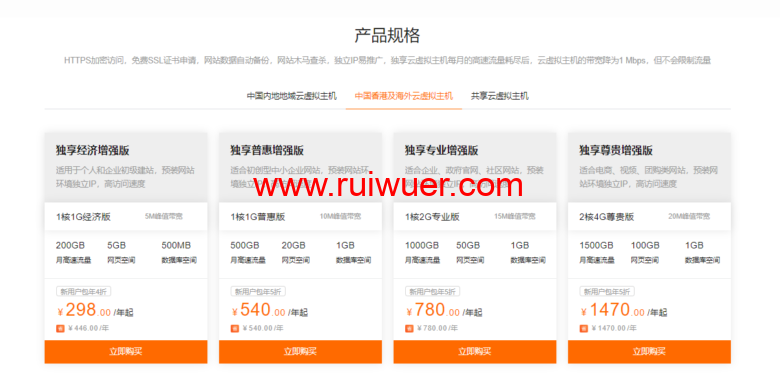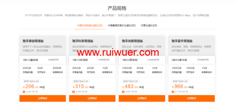 主要包括中国内地云虚拟主机(使用需要备案)和中国香港及海外云虚拟主机,价格分别如下。