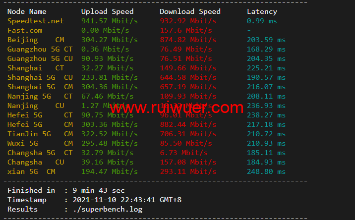 speedtest.net的国内三网节点测试下上下行带宽,晚高峰测试