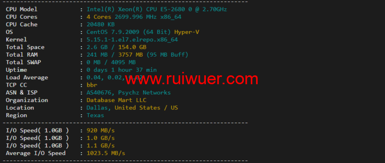 配置信息,CPU为E5-2680 2.7G主频,默认开启bbr测试,硬盘I/O平均为1023MB/s,非常优秀