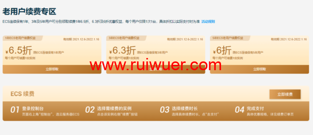 - ECS连续保有1年、3年及5年用户可分别领取续费1年6.5折、6.3折及6折优惠权益,每个用户仅限1次1台,具体折扣以实际支付时为准