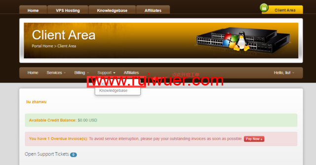 进入搬瓦工官网之后,登录到后台,然后点击 Support -> Tickets,就可以看到目前新版的工单页面。