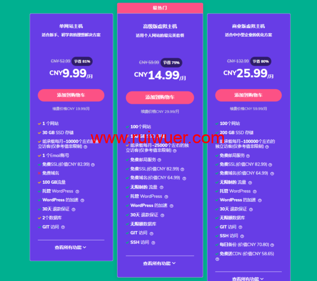 我们可以看到虚拟主机的三个方案,第一个方案只能搭建一个站点,一般不选择,第二个方案比较有性价比的。