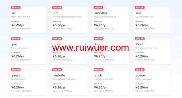 此次活动域名包括:.us、.biz、.monster、.icu、.pw、.uno、.link、host等,更全面的域名方案可以参考官网。