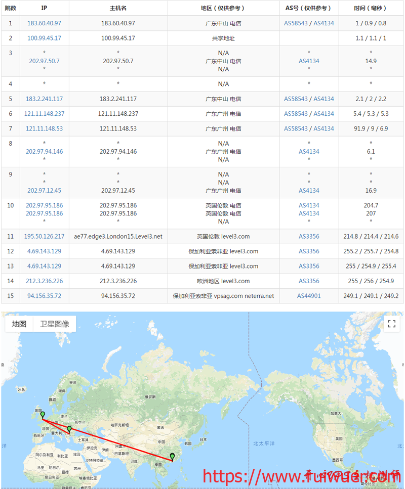 电信绕英国,联通绕的比较多了,先美国,后英国,再到法国,好吧!绕一圈。移动线路也不太好,看来只适合欧洲业务。