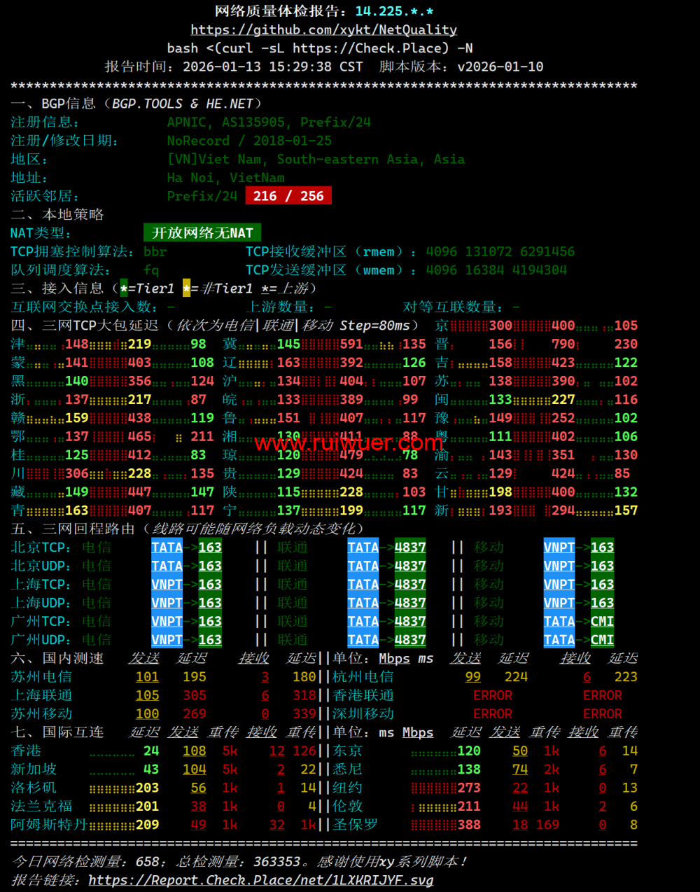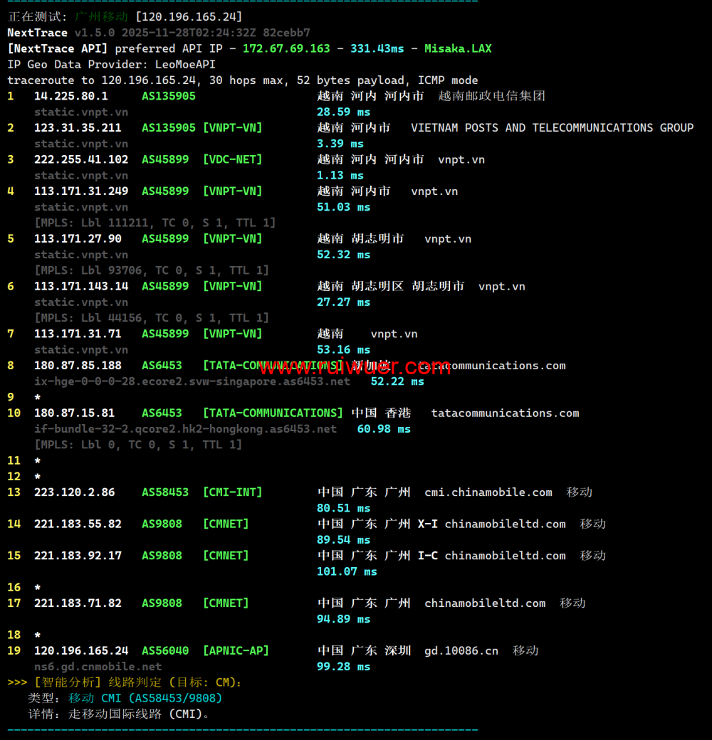 机房硬件性能稳定,去程线路,电信联通骨干直连,移动借香港直连,回程移动线路依托 CMI 国际线路表现最佳,电信走 163 骨干网线路,联通线路走民用骨干延迟较高,原生支持越南区流媒体平台,可解锁 Netflix(越南区)、TikTok、YouTube 等主流平台,Disney + 暂不支持,适合东南亚内容分发类场景。