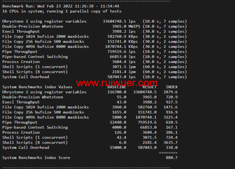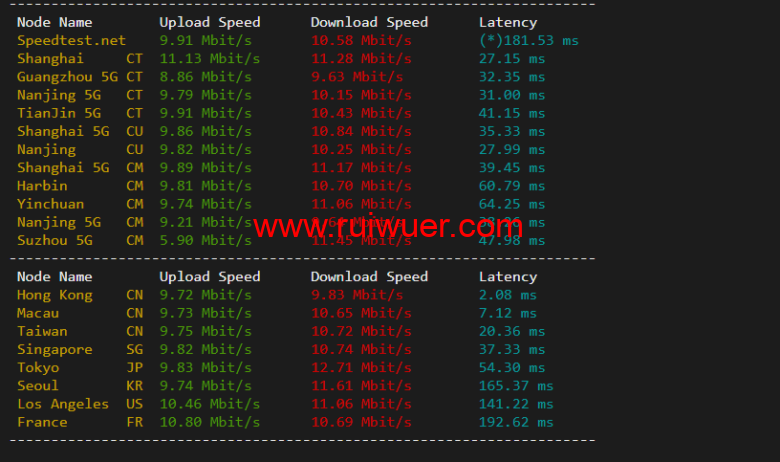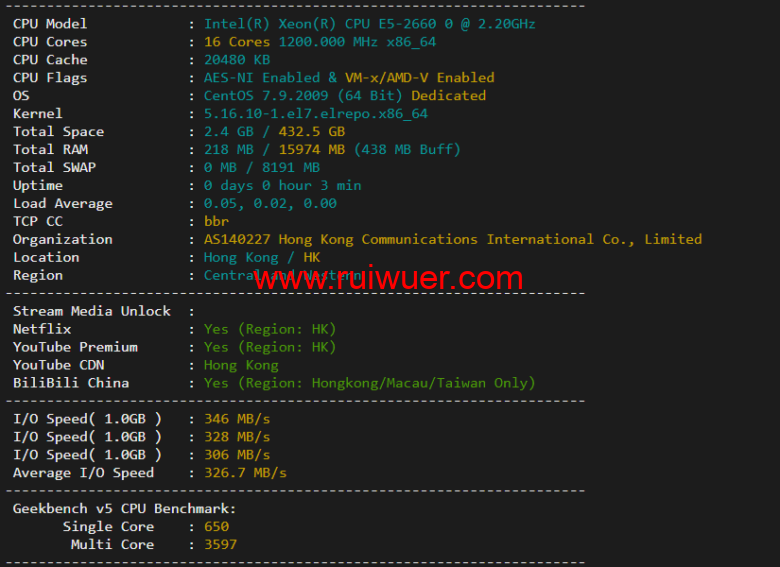 配置信息:CPU为e5-2660、16G内存、500G SSD、10M带宽、3个IPv4,开启bbr测试。平均硬盘I/O在326MB,上方红色标记套餐